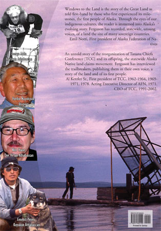 Windows to the Land is an untold story of the reorganization of Tanana Chiefs Conference [TCC] and its offspring, the statewide Alaska Native land claims movement. Judy Ferguson has interviewed the trailbreakers, publishing them in their own voice, a story of the land and of its first people.